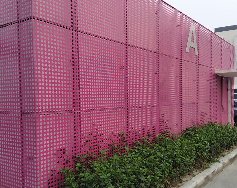 氟碳沖孔鋁單板是采用代號(hào)1200H26、1070H26、5005H26等鋁板幕墻的專用單層鋁板作為原材料。在通過數(shù)控設(shè)備的精雕細(xì)琢,裁剪沖壓,再通過數(shù)控折彎等工藝技術(shù)成型。鋁板的表層在采用氟碳油漆的噴涂或是粉末噴涂等工藝來做表面的處理形成幕墻的裝飾材料。